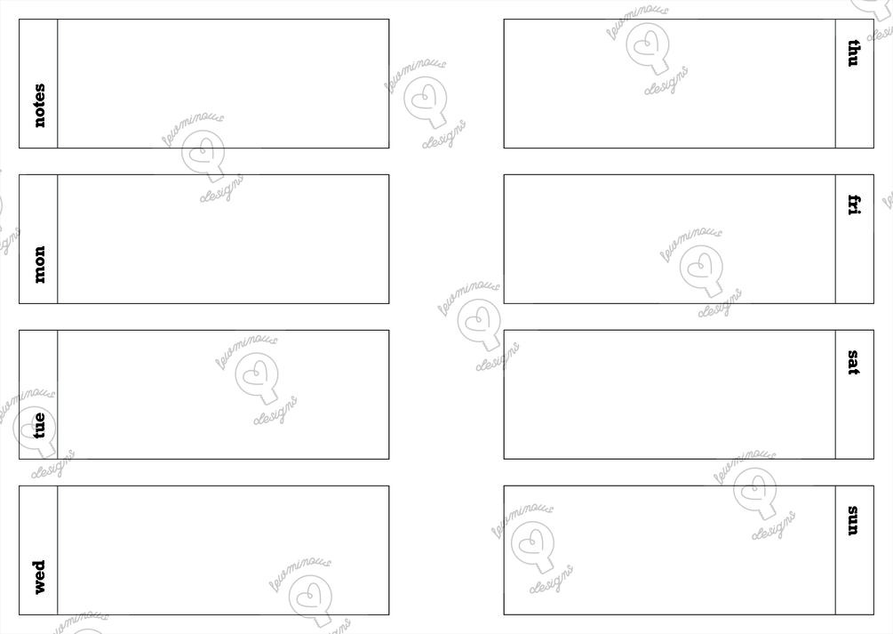- All Weekly Double-Page Horizontal Spread PDFs have Monday start with "Notes" after Sunday, Sunday start with "Notes" after Saturday, Monday start with "Notes" before Monday, and Sunday start before Sunday. Check out the thumbnails for more information.
