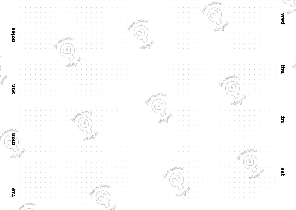 - All Weekly Double-Page Horizontal Spread PDFs have Monday start with "Notes" after Sunday, Sunday start with "Notes" after Saturday, Monday start with "Notes" before Monday, and Sunday start before Sunday. Check out the thumbnails for more information.
